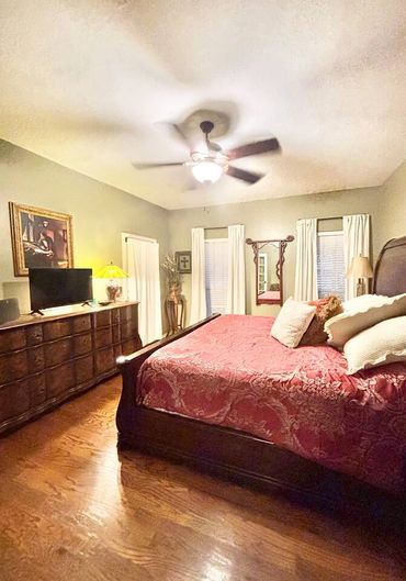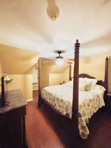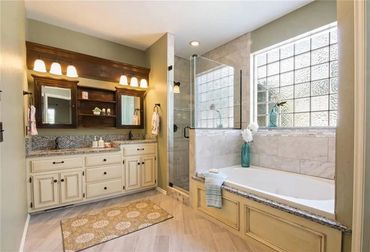 The master has its own private bathroom with full size shower and a large jetted tub, private toilet and walk-in clothes closet. There is a powder bath on the first floor as well. The upstairs bathroom services the two rooms upstairs and is a full bathroom with a tub/shower combo.
