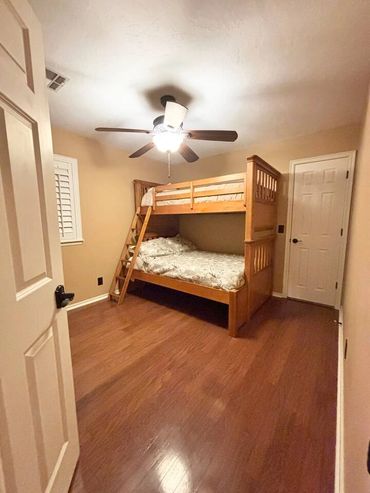 A wonderful 2 story home in the heart of Edmond features two dining areas, a spacious living room, and a master suite. There are 3 bedrooms and a total of 4 beds. Two of the bedrooms have king size beds and the third bedroom offers a bunk bed with a full size lower mattress and a twin size upper mattress. Each bedroom has a television. There is also a comfortable sitting area upstairs with a large television, and small study desk and games.
